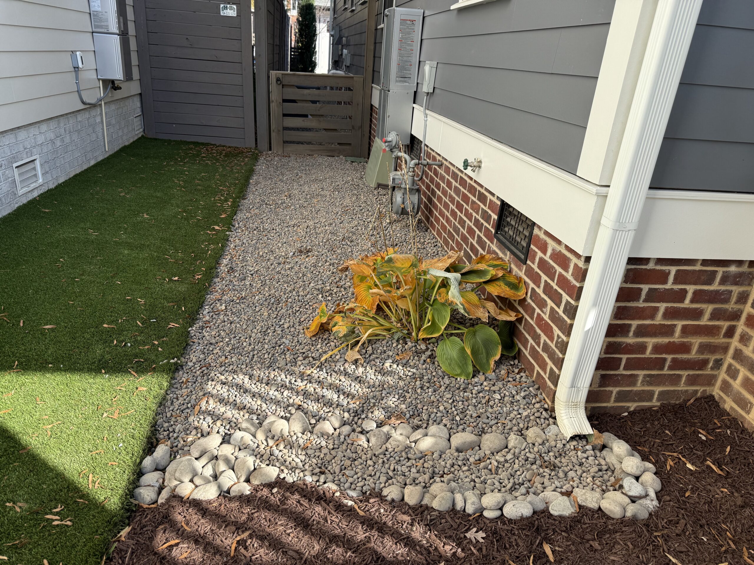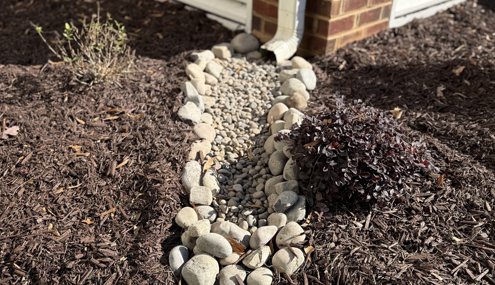 Decorative stone installed in a prepped and graded area on top of the ground to direct water runoff to a desired area.